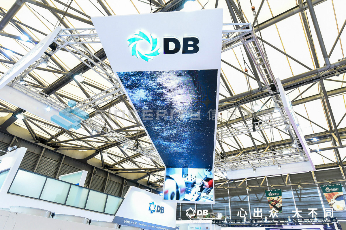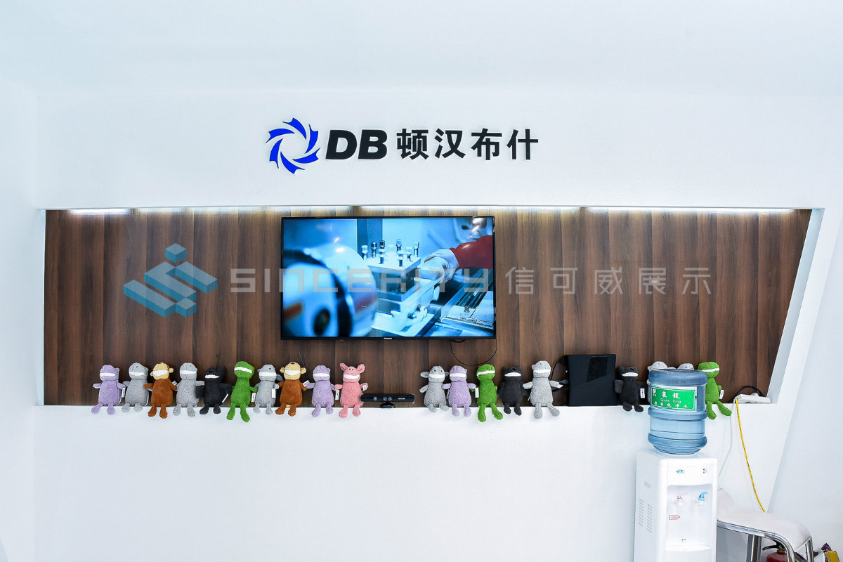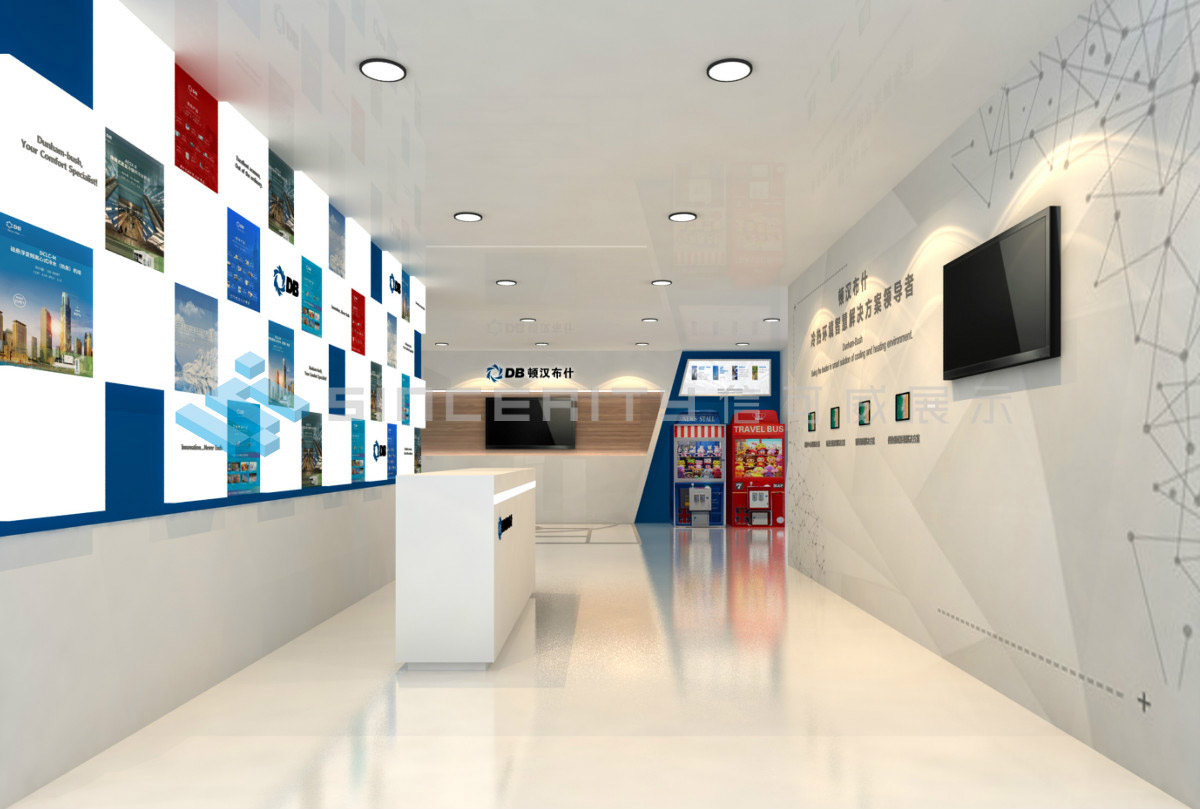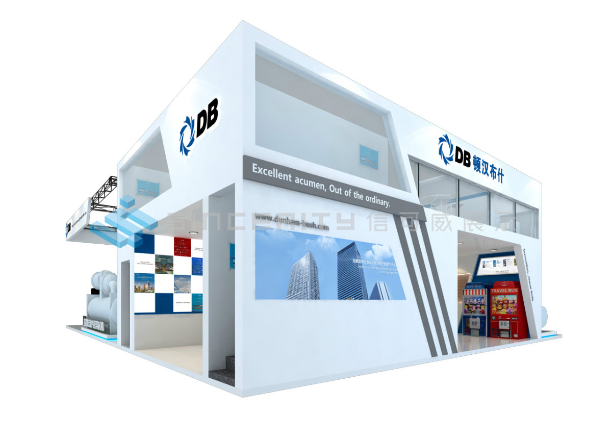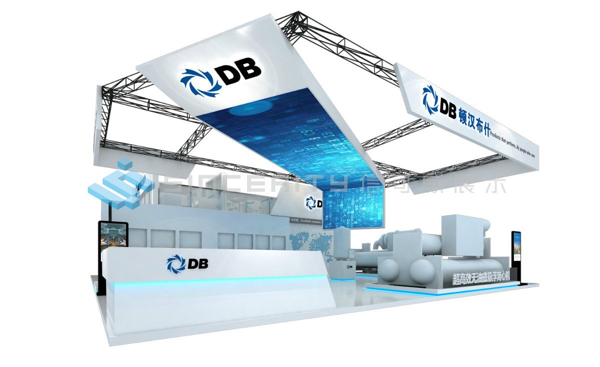 DB頓漢布什展臺(tái)設(shè)計(jì)以白為主色,藍(lán)色為輔色,展臺(tái)中央采用高科技折屏,著重突出DB品牌和產(chǎn)品的展示,契合DB全球品牌戰(zhàn)略的輸出,將情懷與科技融為一體。